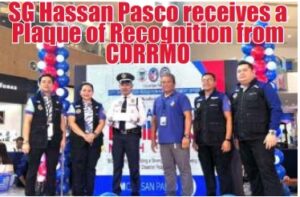 SG Hassan receives a plaque of recognition from the City Disaster Risk Reduction and Management Office officials:...