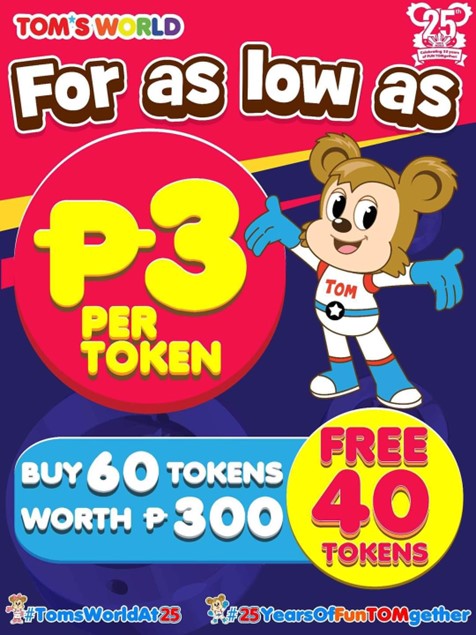 SM CENTER IMUS, CAVITE – Happy Tom’s Day! On our 25th year of happiness and fun TOMgether, enjoy the new token promo for as low as 3 pesos per token for every purchase of 60 tokens worth 300 pesos! Receive free 40 tokens on top of your 60 purchased tokens for a more enjoyable day to relieve stress, or family playtime bonding. Hurry and visit Toms World at SM Center Imus today with your arcade buddy and score more tickets and rewards.